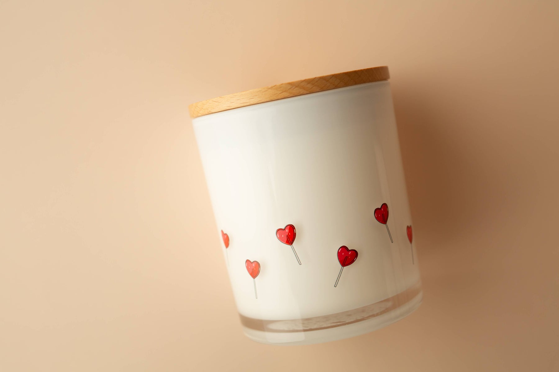 The sweetest candle to celebrate Valentine's Day! The favorite, well-known heart sucker is printed and wrapped around the entire color in its classic bright red color.