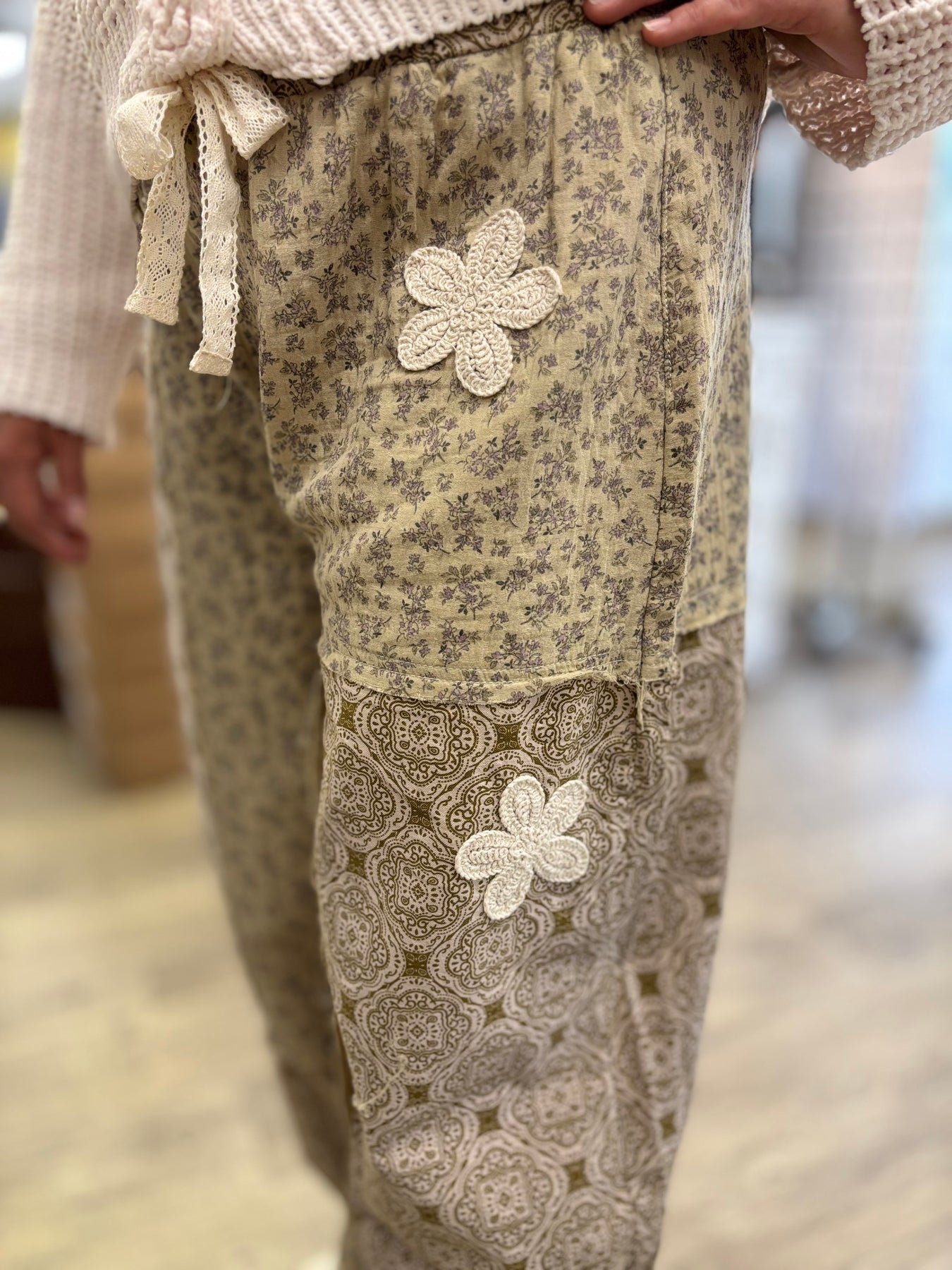 The Free Spirit Pants by POL brand are a true boho dream — featuring an olive and sand color mix with delicate floral embroidered patches, a lace waist tie, and adjustable ankle ties for that perfect flowy fit. Unique, detailed, and totally one of a kind — these pants bring all the free-spirited fall vibes.