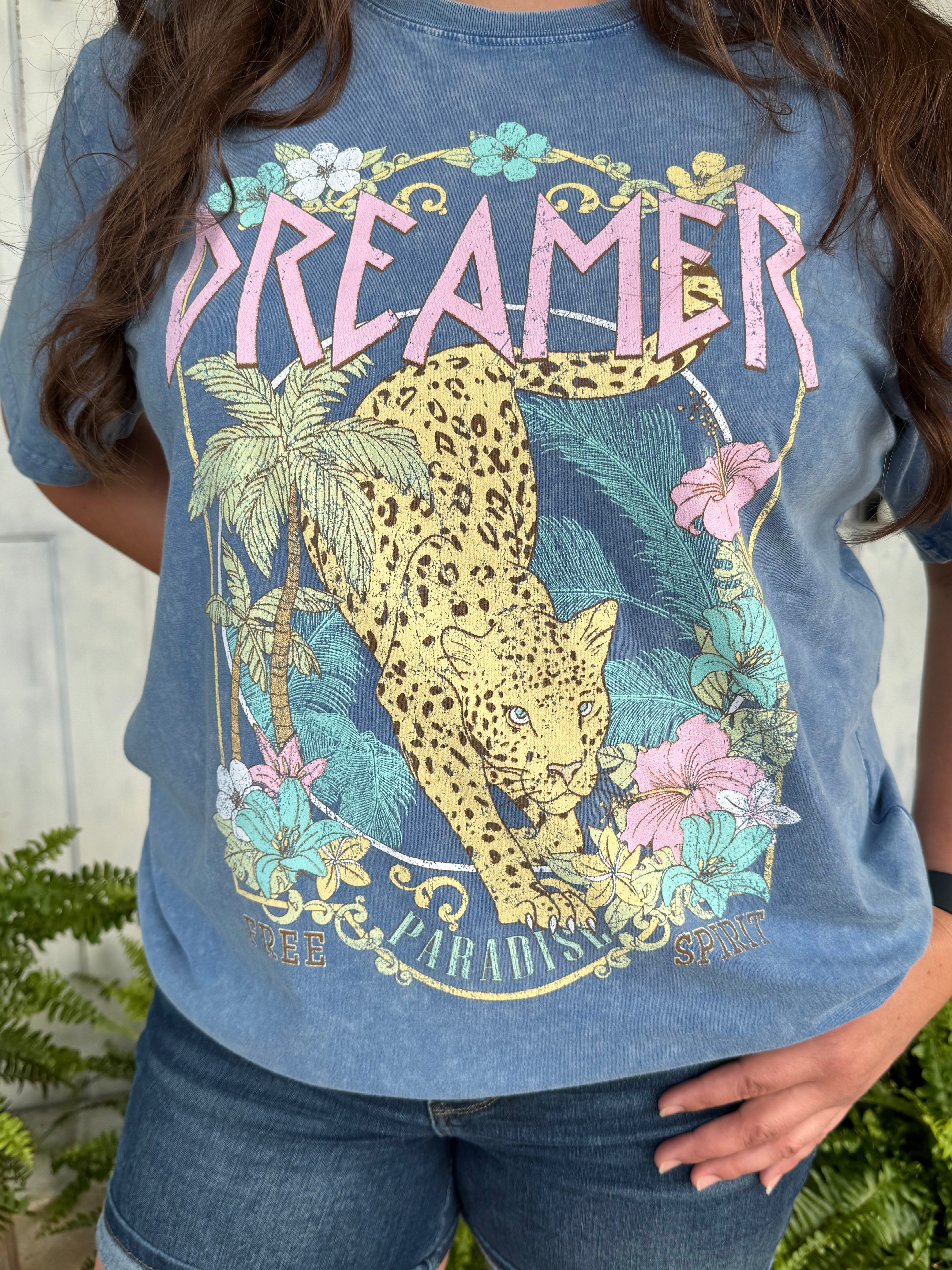 Bold, wild, and made to dream. This Zutter brand graphic tee features a vibrant “Dreamer” design with a paradise-inspired leopard print. Soft, comfy, and full of attitude—perfect for styling solo or layering up.