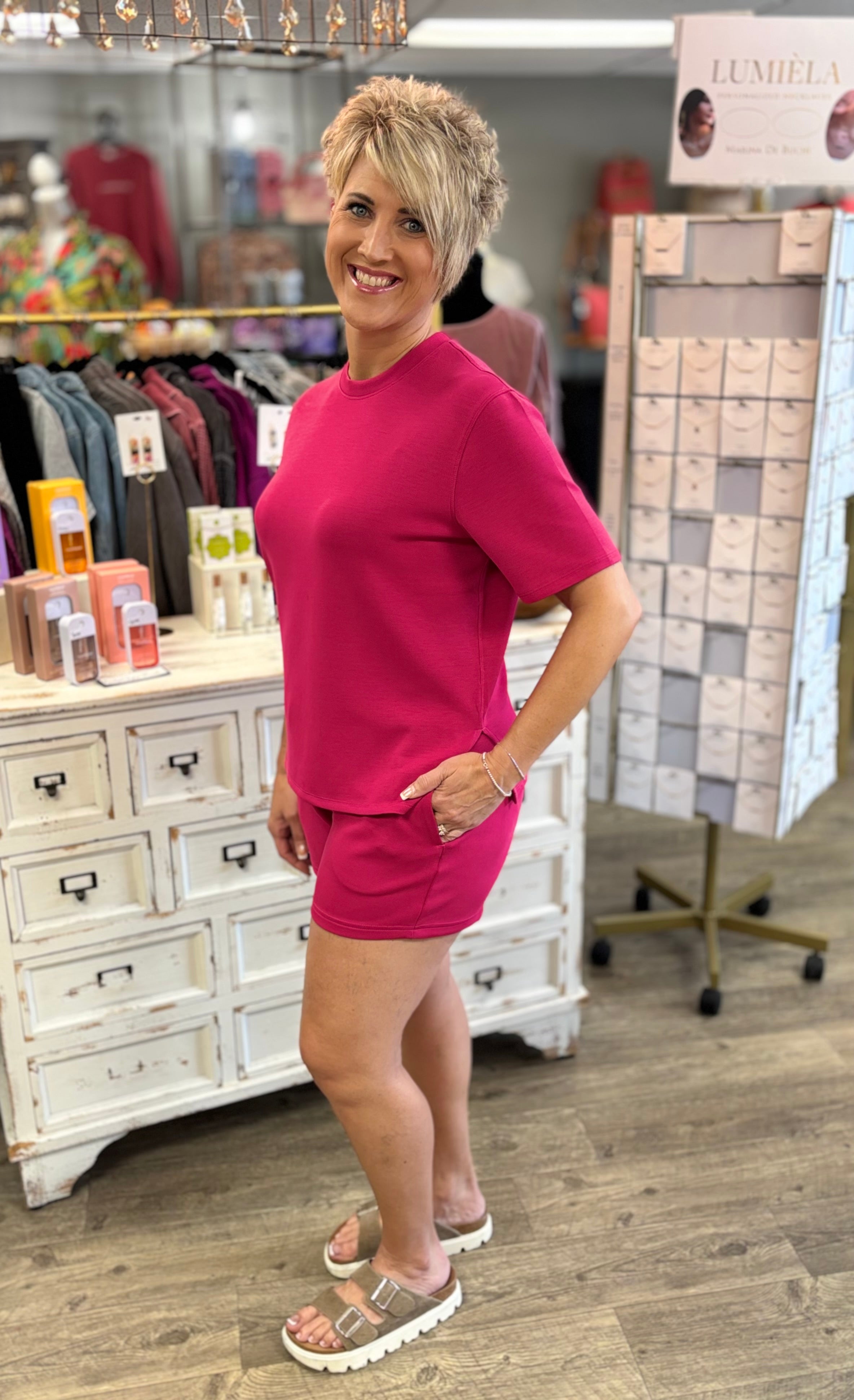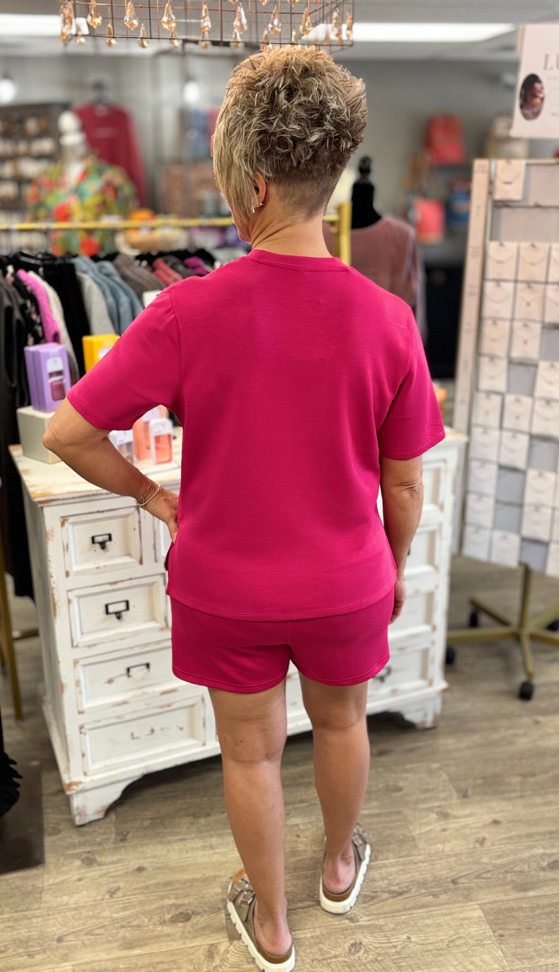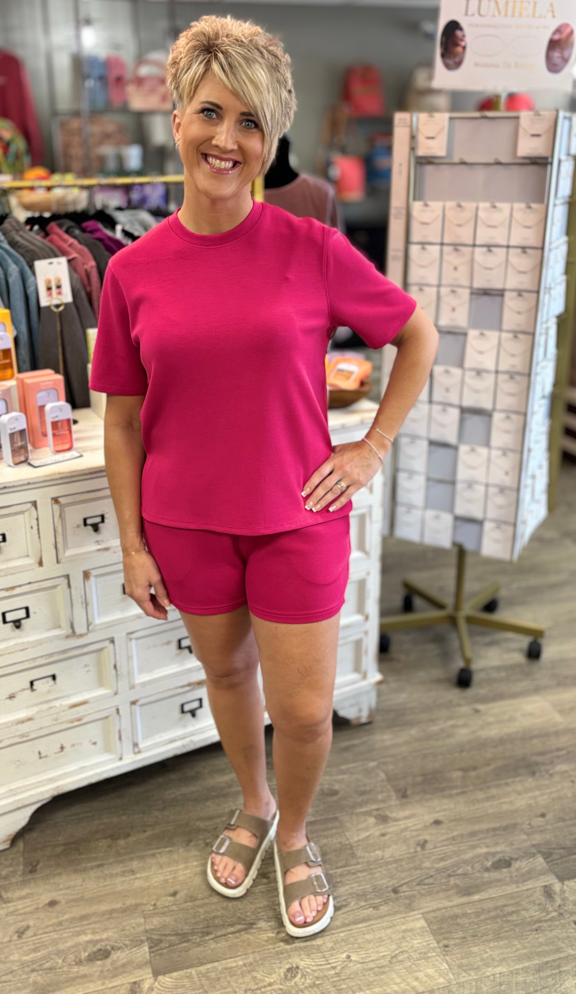 Soft, sleek, and effortlessly put together. The Laguna Scuba Tee Set is the perfect mix of comfort and style, featuring a matching short sleeve top and shorts in the most beautiful plum pink color.