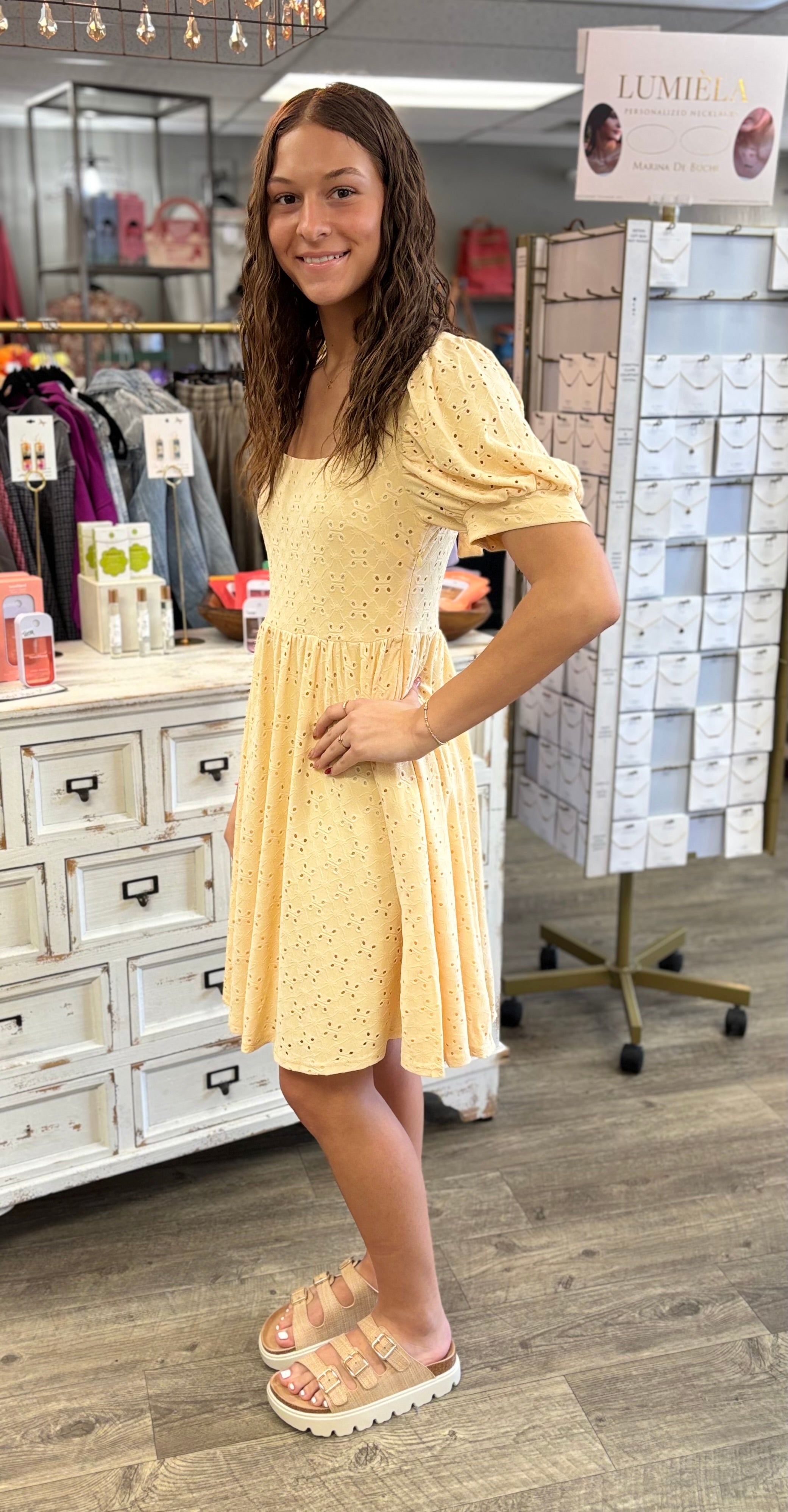 Sweet, sunny, and made for warm days. The Little Miss Sunshine Dress features a soft baby yellow color with delicate eyelet detail that gives it a fresh, feminine look perfect for the season. Light, bright, and effortlessly pretty, it’s the kind of dress that feels just right for spring and summer days.