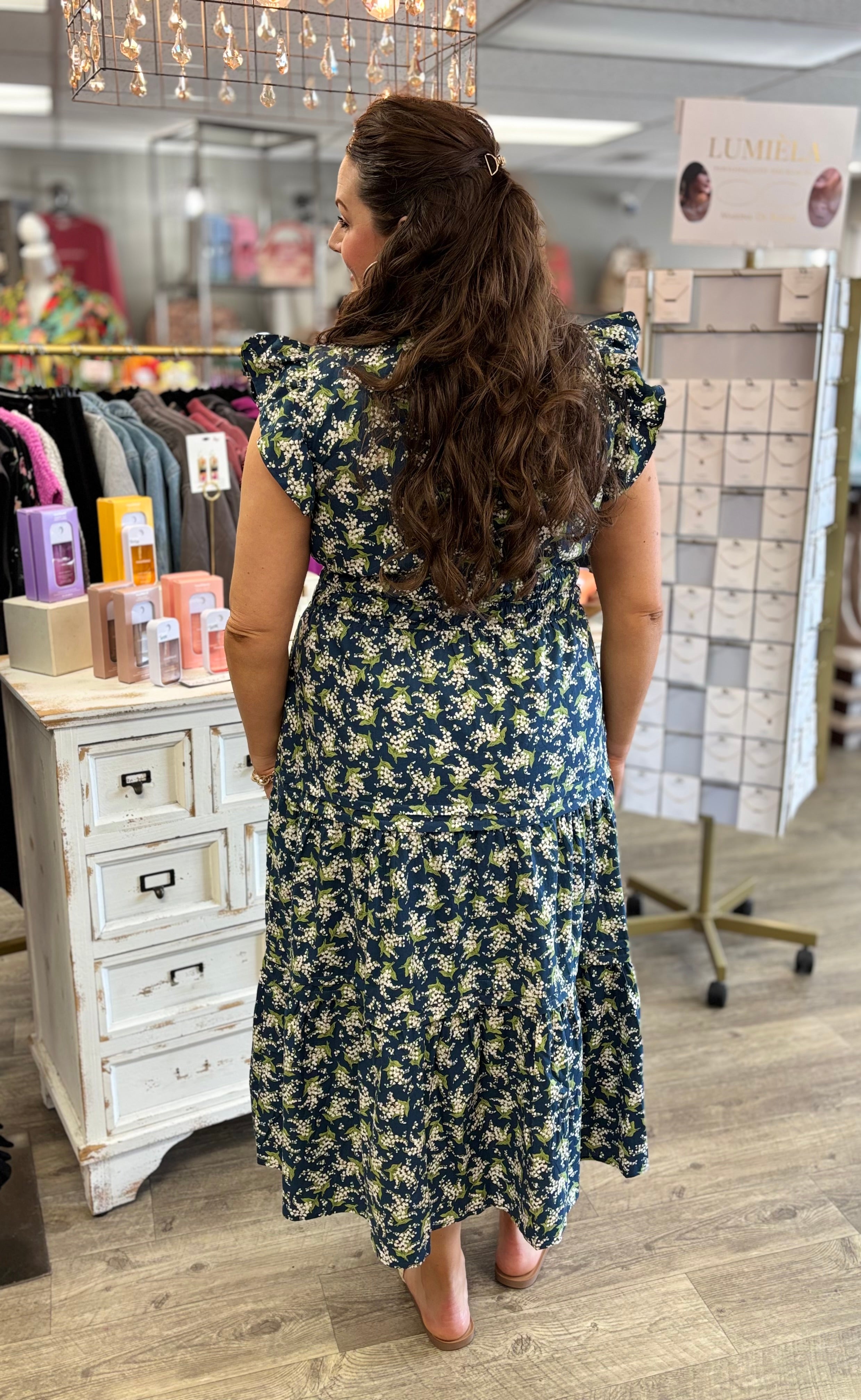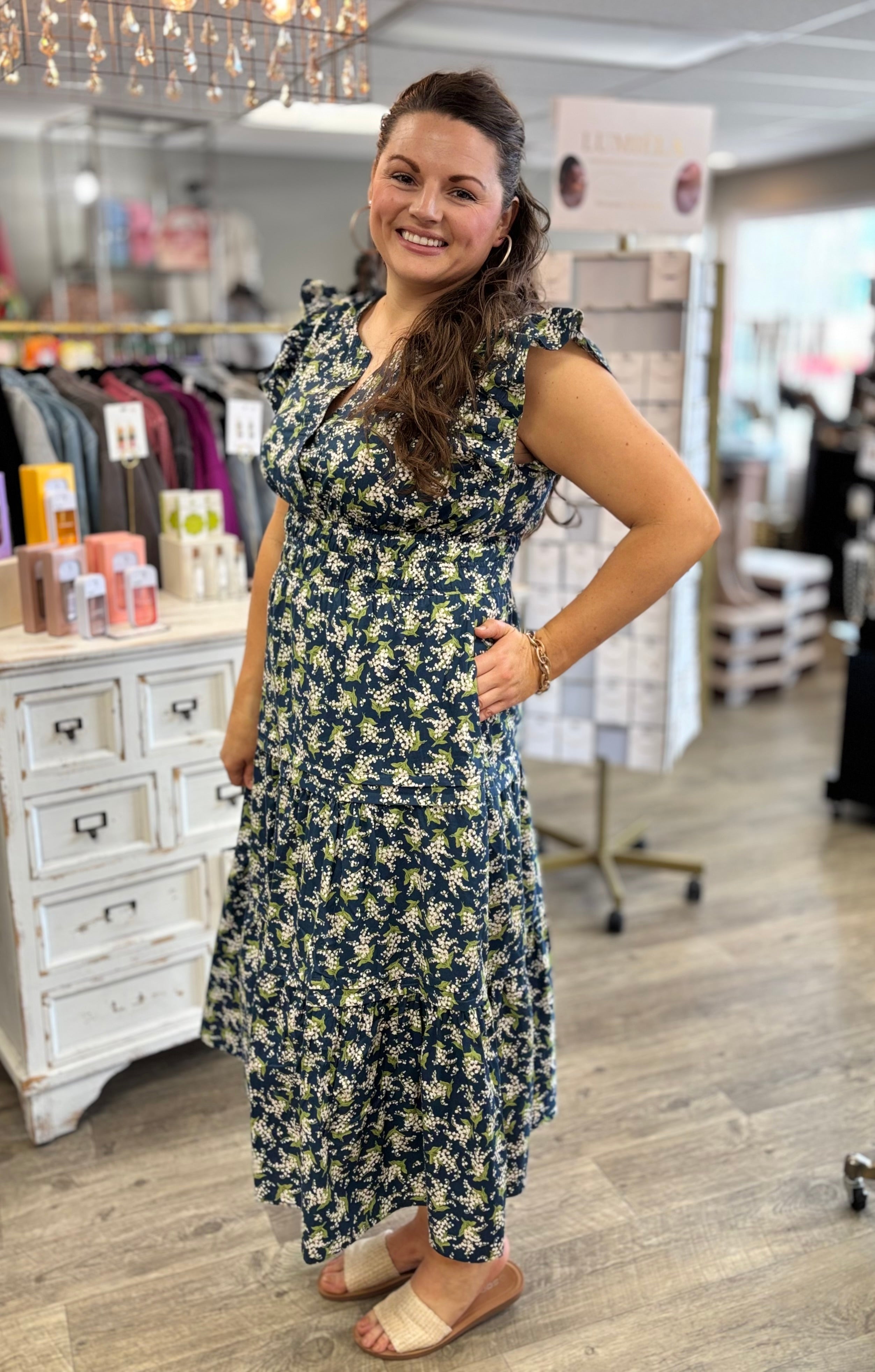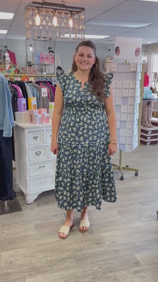Feminine, flowy, and effortlessly pretty. The Sweetest Thing Dress features a beautiful navy background with soft green and white floral accents that give it a timeless, romantic feel. The maxi length creates an elegant silhouette that’s perfect for everything from casual days out to special occasions.