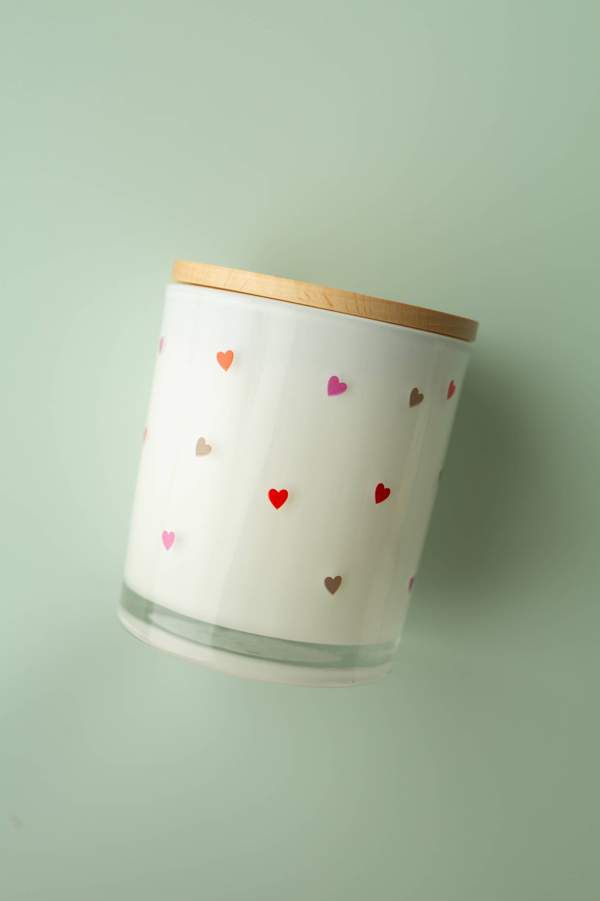 The sweetest candle to celebrate Valentine's Day! This dainty design features tiny hearts in tan, pink and red wrapped all the way around the candle.