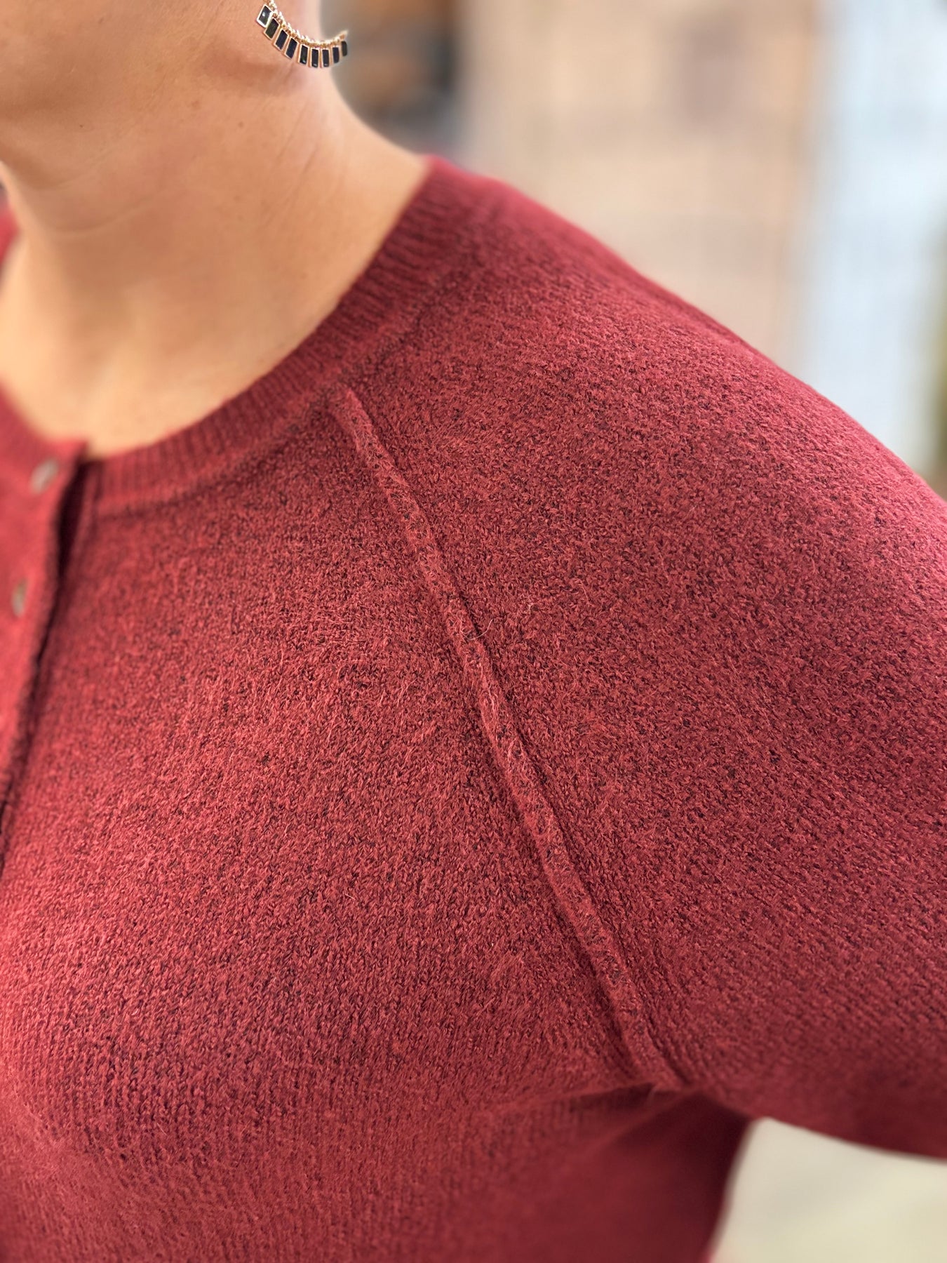 The Raglan Sleeve Henley Relaxed Knit Sweater is all about effortless cozy vibes. With a soft, relaxed fit and rich shades of brown, navy, and redwood, it’s perfect for layering or rocking solo for a warm, stylish look. Warm and cozy.