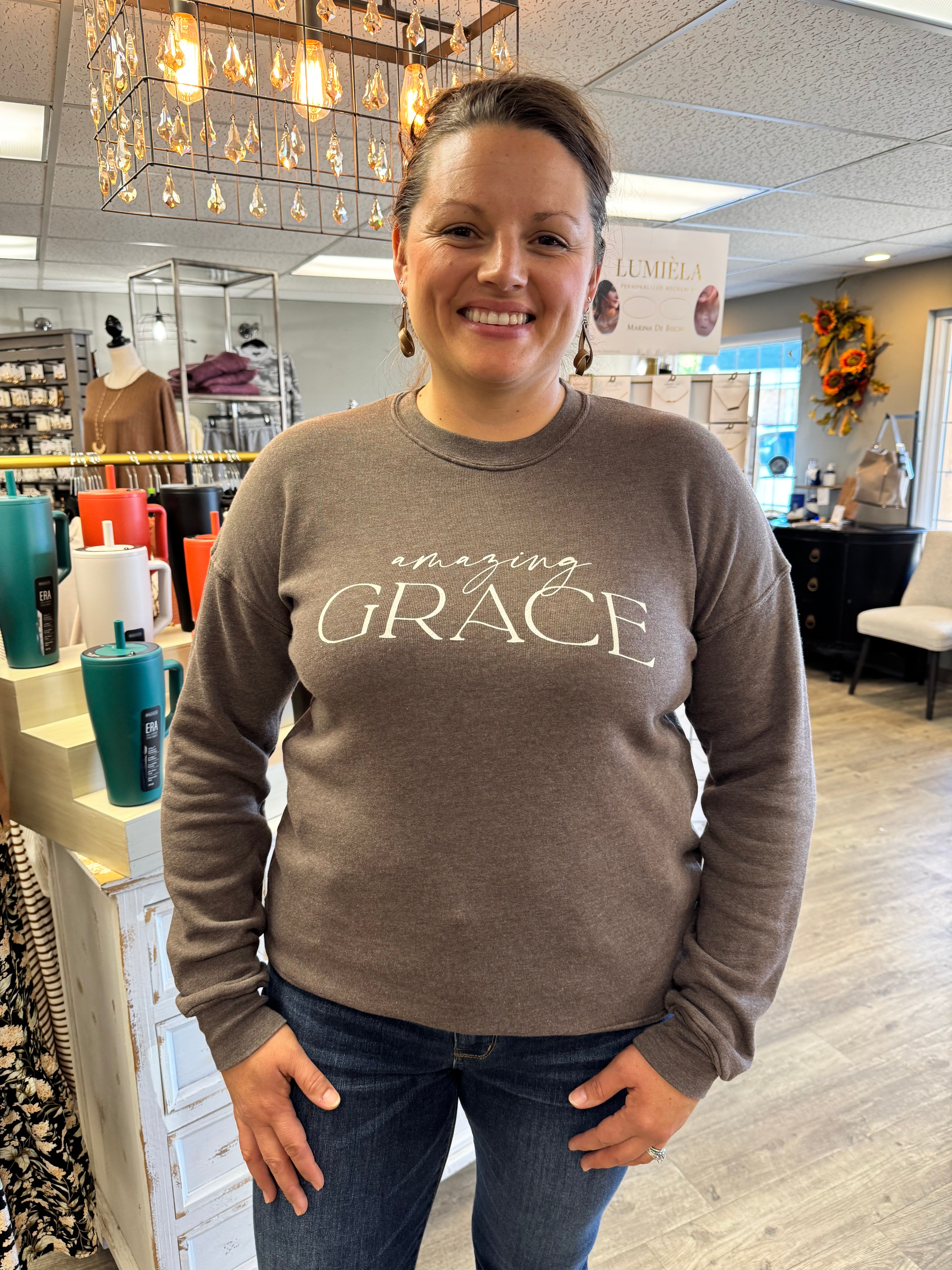 Our Amazing Grace Graphic Sweatshirt with an authentic vintage look and a softer feel that is only possible to achieve by using our special enzymes to dye and mineral wash processes.