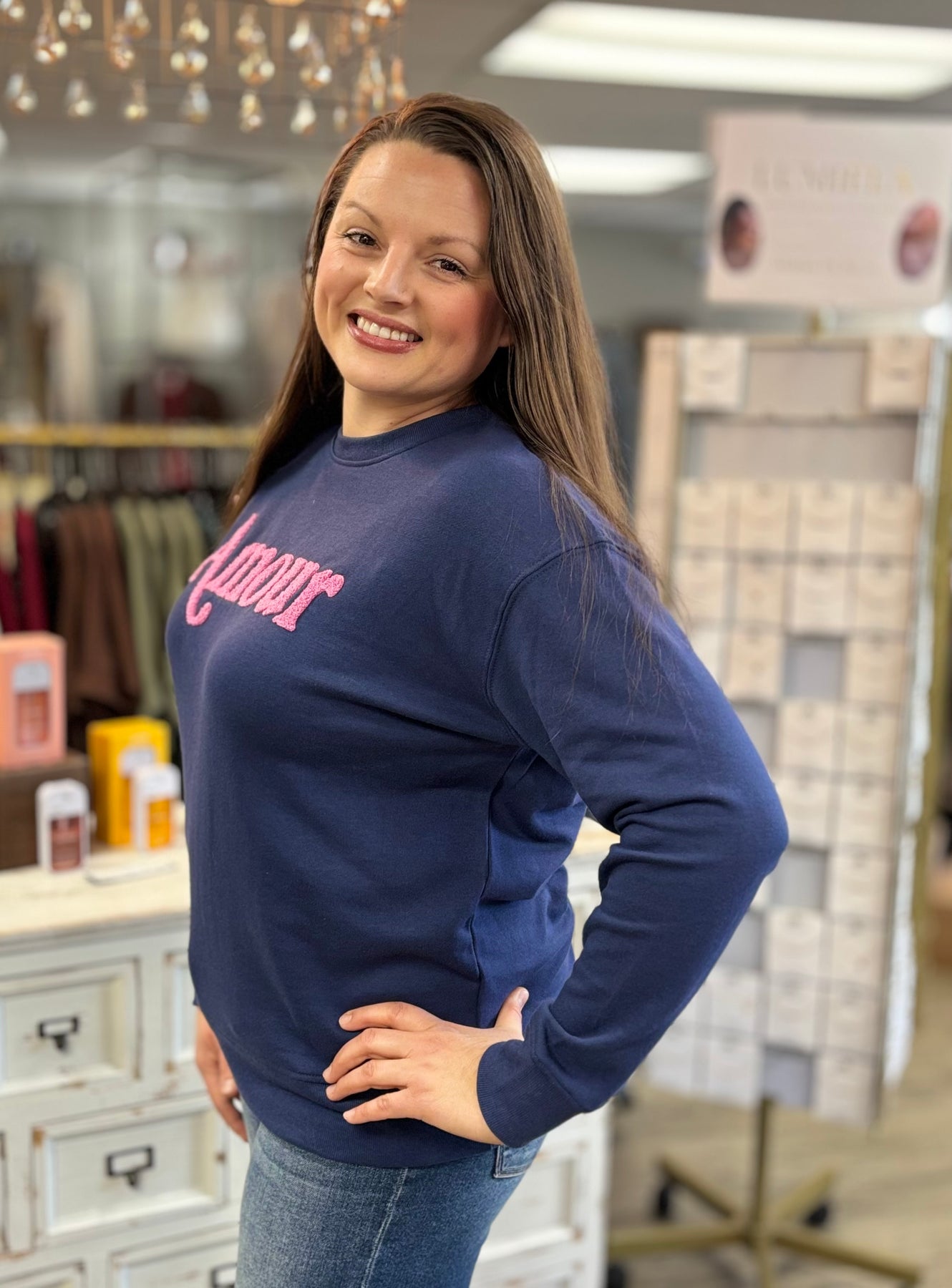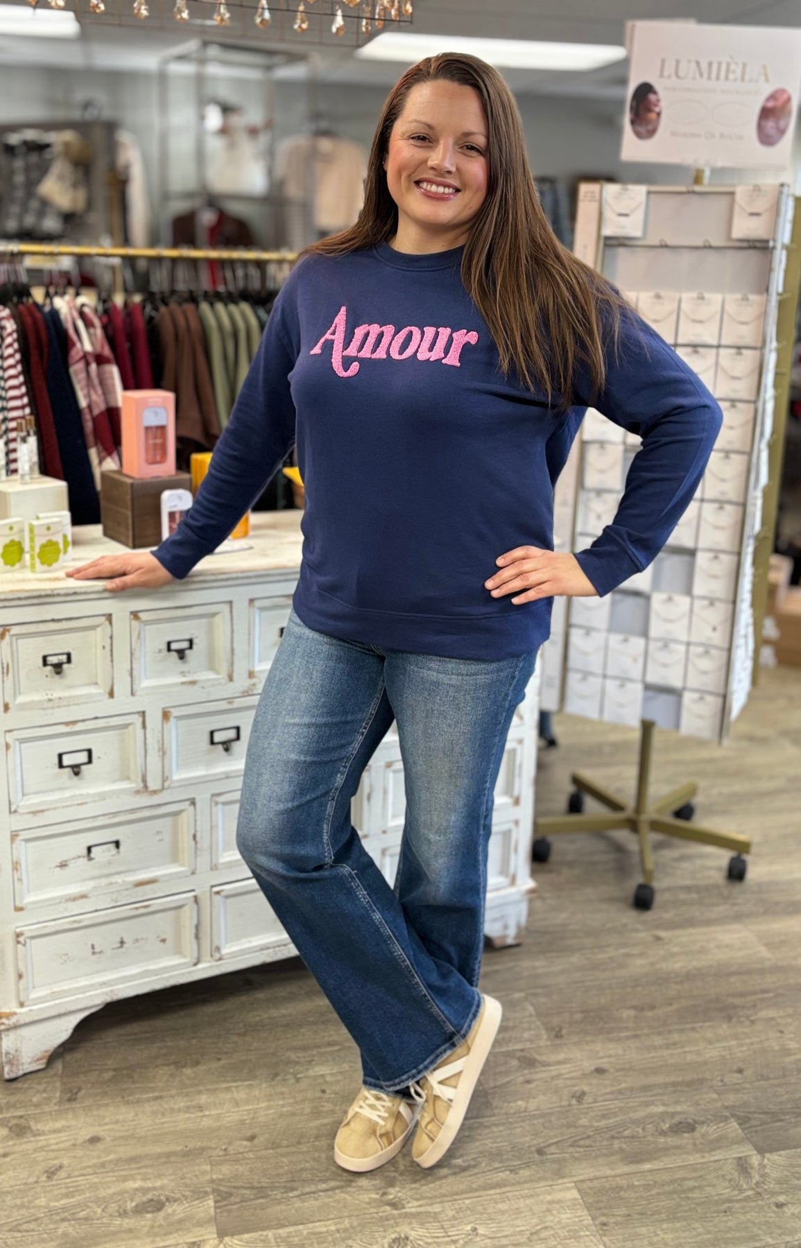 Celebrate Valentine's Day with our 'Amour' Sweatshirt printed in a playful pink that pops just right. Soft, cozy, and a little flirty. Easy to toss on with jeans or layered over a skirt for that effortless boutique look ๐Ÿ’—๐Ÿ’™