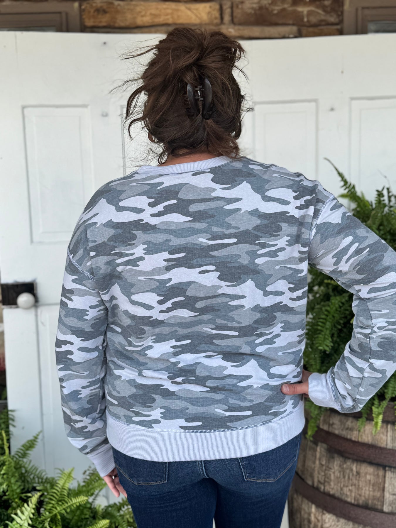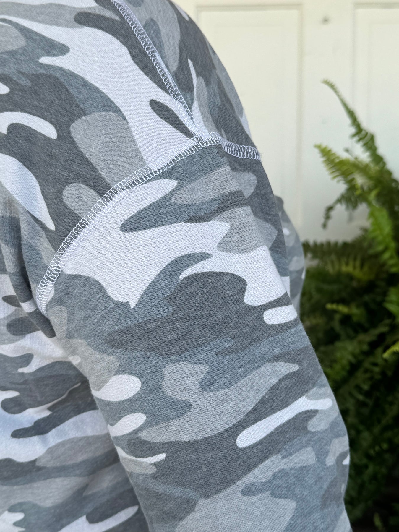 Cozy and effortlessly cool, this grey-tone camo French terry top features a classic crew neck and long sleeves. Soft and lightweight, it’s perfect for layering or wearing on its own for a relaxed, modern look.